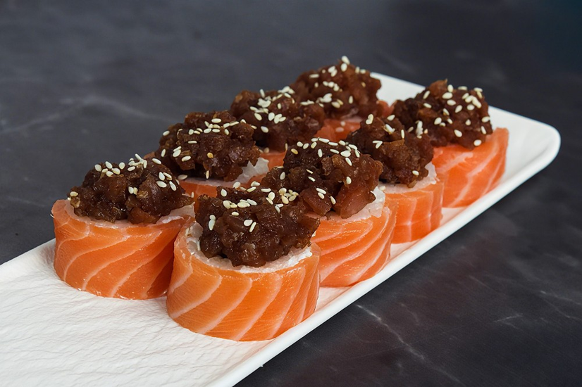 Склад: тунець,лосось,крем-сир,спайс соус,кунжут,норі,рис.