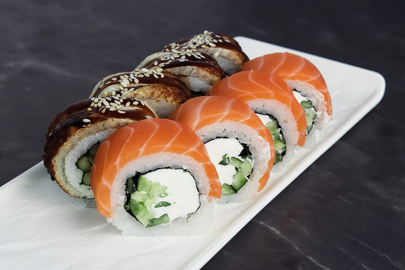 Склад: лосось,вугор,крем-сир,соус унагі,авокадо,кунжут,норі,огірок,рис.