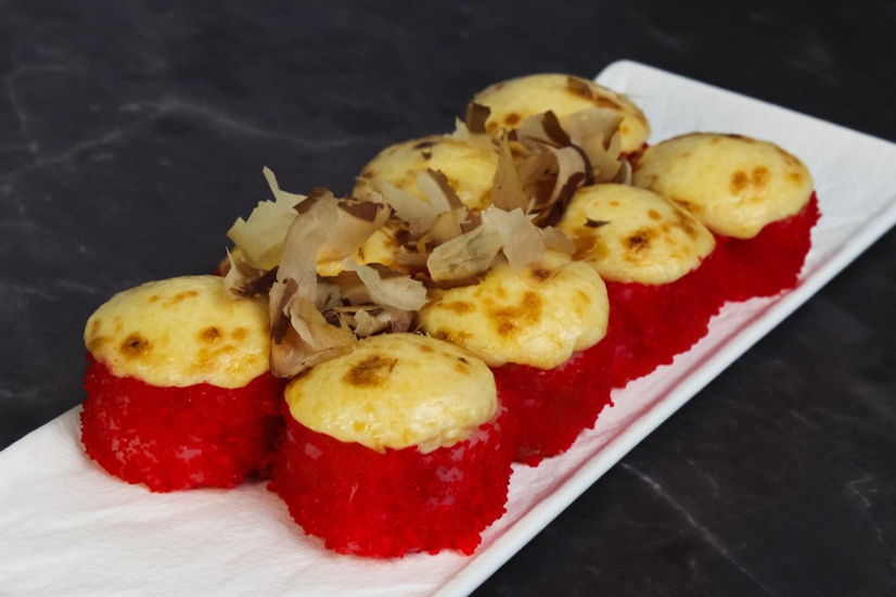 Склад: креветка,крем-сир,авокадо,стружка тунця,ікра,сирна шапочка,норі,рис.