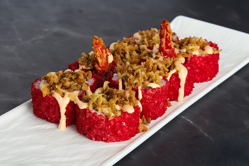 Склад: креветка темпура,спайс соус,крем-сир,сухарі,цибуля фрі,норі,рис.