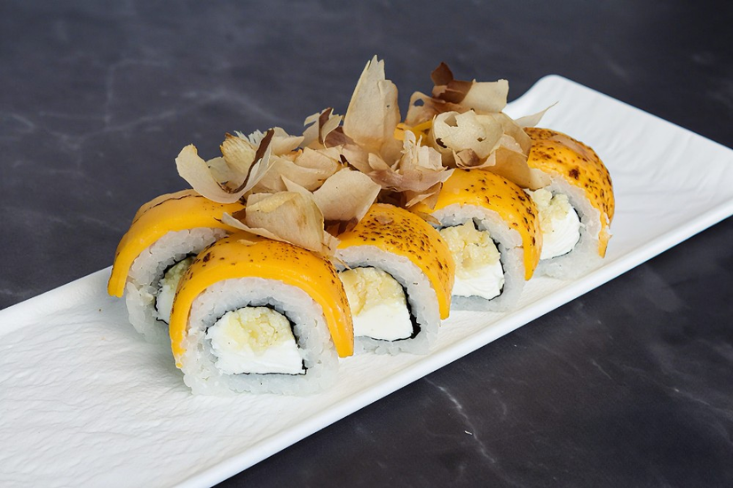 Склад: сир гауда,крем-сир,сир чеддер,стружка тунця,норі,рис.