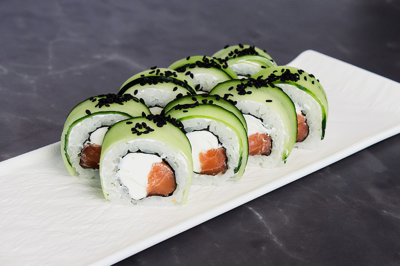 Склад: лосось,крем-сир,огірок,кунжут,норі,рис.