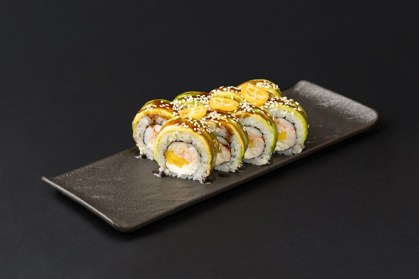 Склад: креветка,авокадо,манго,соус унагі,кунжут,сир філадельфія,норі,рис