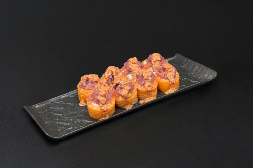 Склад: тунець,лосось,сир філадельфія,соус масаго спайс,норі,рис
