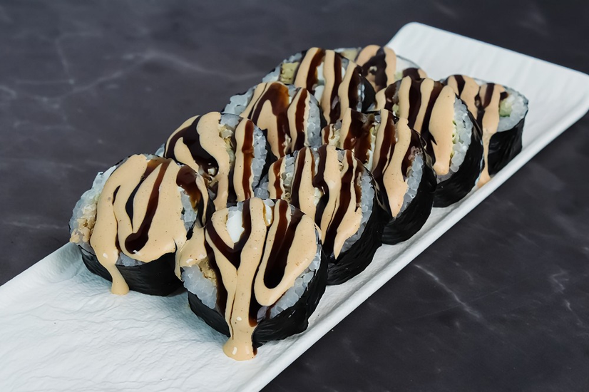 Склад: тунець,огірок,омлет,крем-сир,пекінка,спайс соус,рис,норі,цибуля фрі.