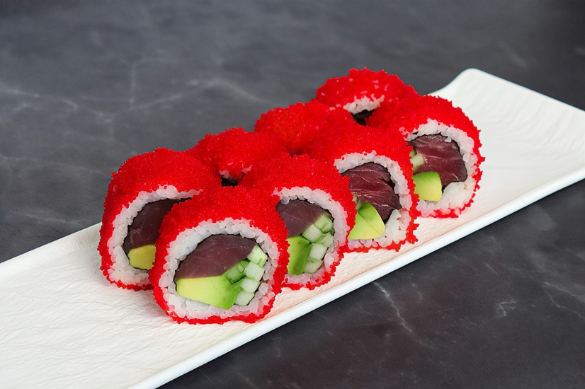 Склад: тунець,ікра,авокадо,норі,огірок,рис.