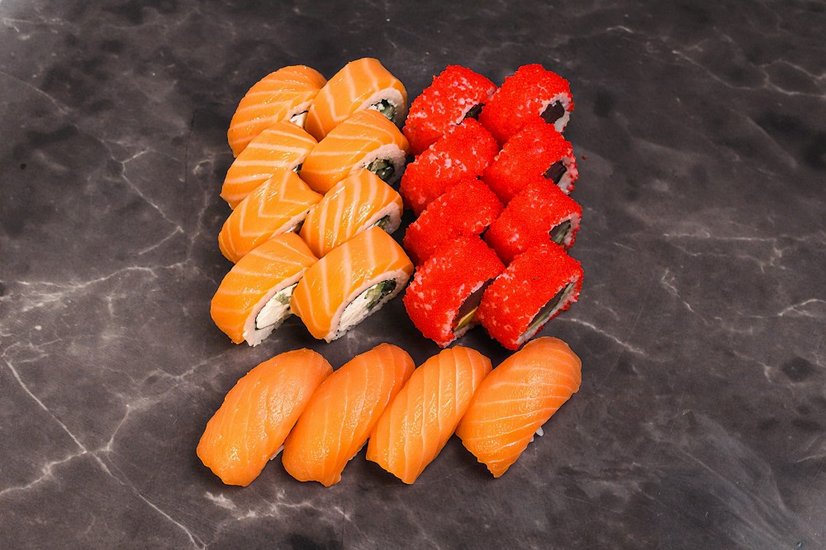 Роли: каліфорнія тунець,філадельфія лосось.Суші: з лососем.