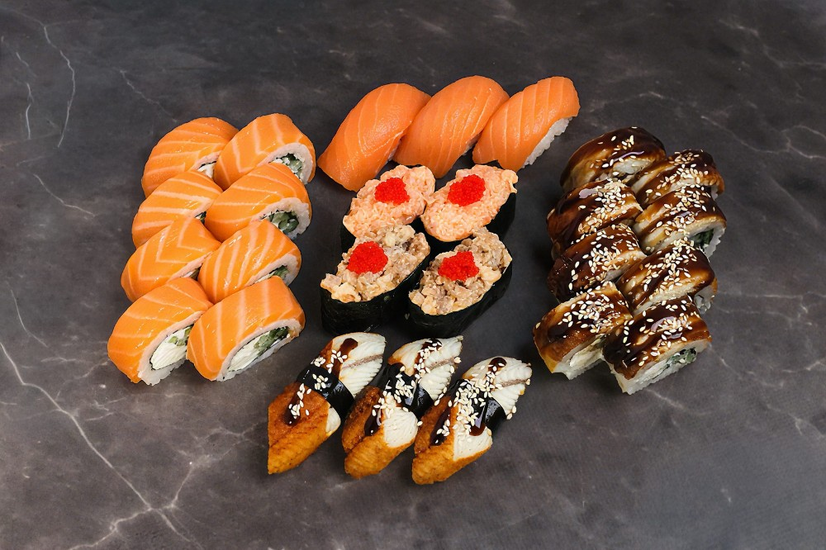 Роли: філадельфія з вугрем,філадельфія з лососем.Суші: з лососем,з вугрем.Гункани: з лососем,з вугрем.