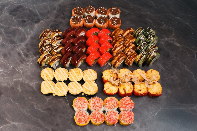 Роли: аляска,каліфорнія з лососем,окамі,філадельфія тунець,панда роллс,вулкан,каніберу,запечена креветка,запечений краб спайс.