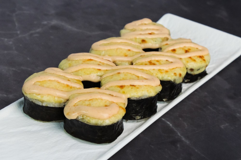 Склад: сніговий краб,спайс соус,крем-сир,огірок,омлет,сирна шапочка,норі,рис.